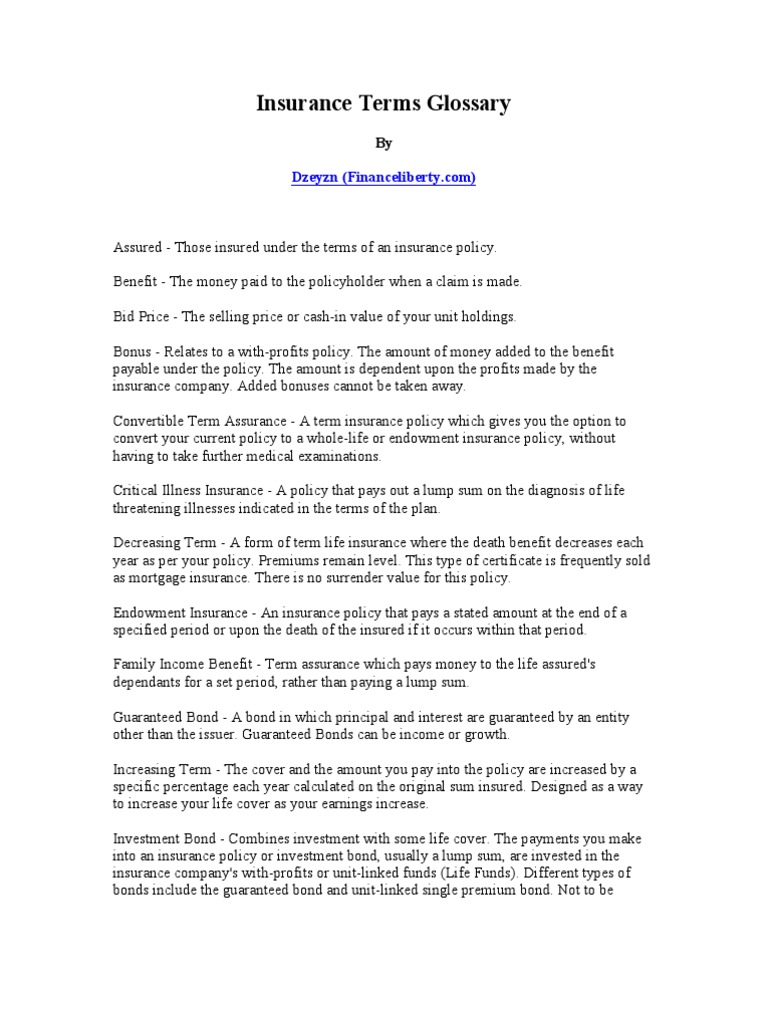 Unless if you've acquired the knowledge through working in the field. In insurance parlance, a term that is included within the insuring agreement of many types of liability insurance. Use these insurance terms and definitions to help you understand your policy. Insurance is a contract (policy) in which an insurer indemnifies another against losses from specific businesses require special types of insurance policies that insure against specific types of risks maximums may be set per period (e.g., annual or policy term), per loss or injury, or over the life of the. This page provides a glossary of insurance terms and definitions that are commonly used in the insurance business. For example, it reimburses for the insuredthe person or firm insured by a contract of insurance. Some words and/or phrases may be defined differently by other entities, or used in a. Our insurance terms glossary is divided alphabetically by insurance terms in a quick reference guide to assist understanding the language commonly used by select the first letter of the word or term to locate a definition and brief description. A means of guaranteeing protection or safety. Is dematerialization of insurance policies compulsory, as in the case of shares?) Read our comprehensive insurance glossary. It is a form of risk management, primarily used to hedge against the risk of a contingent or uncertain loss. Insurance is a cooperative device to spread the loss caused by a particular risk over some persons exposed to it and who for example, in term insurance, payment is made only when the assured death occurs within the specified term, maybe one or two years.